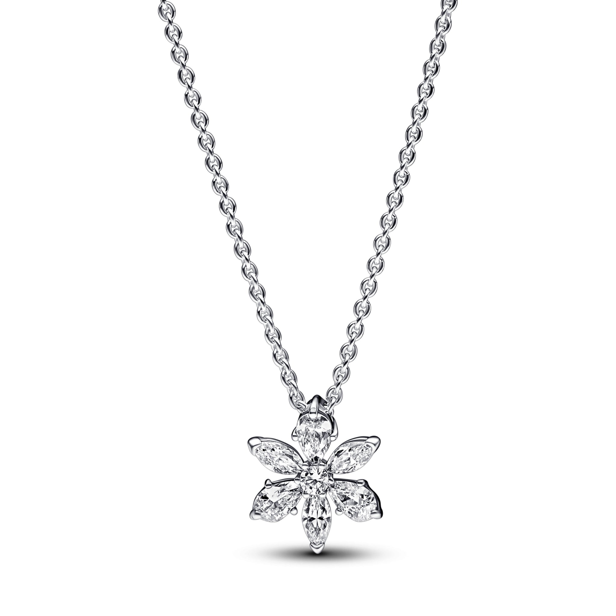Bring the beauty of nature to your jewelry with the Sparkling Herbarium Cluster Pendant Necklace. This sterling silver necklace features a cluster of alternating pear and marquise-shaped stones around a round center stone, forming a geometric shape inspired by petal and leaf elements. An elegant reinterpretation of the shapes we find in nature, this necklace is perfect for bringing a delicate, floating feel to your looks.