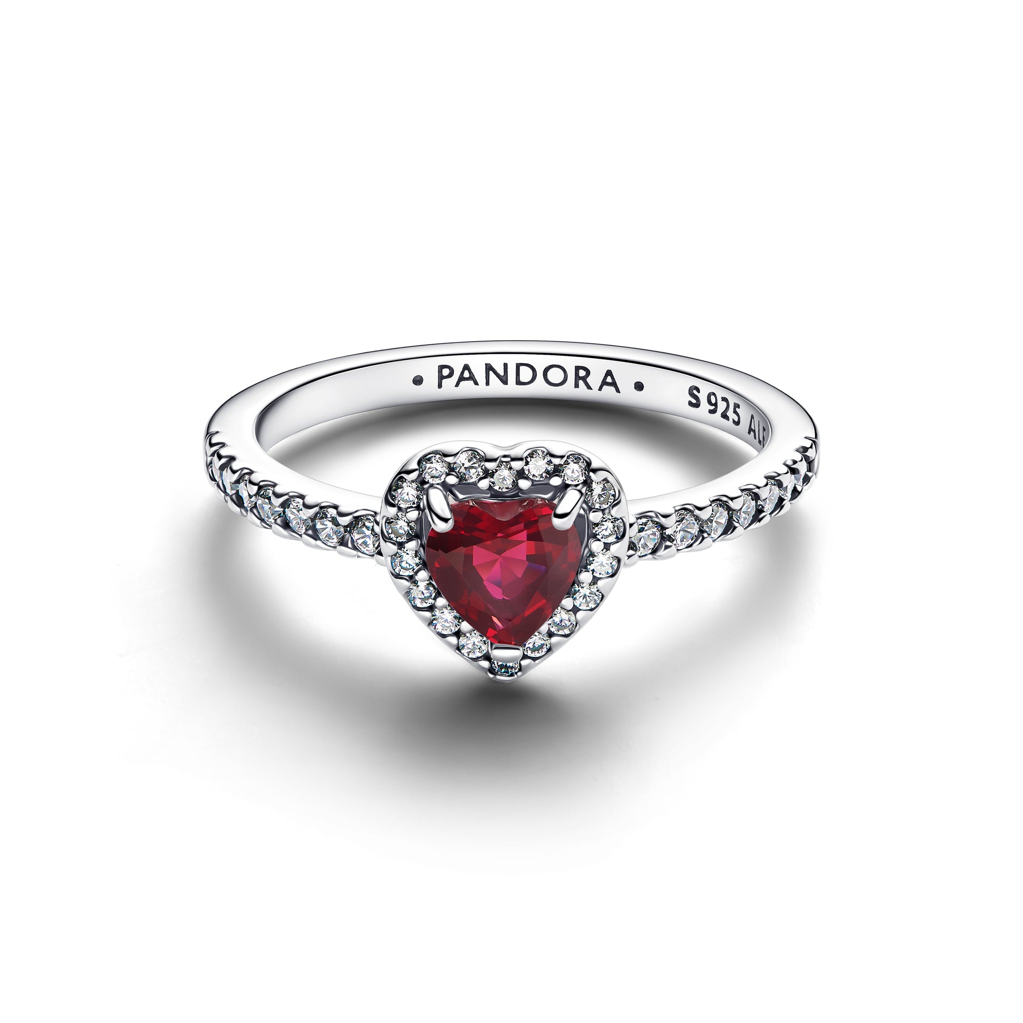 All heart, all sparkle. Our sterling silver ring features a raised red heart crystal with a pavé halo and half-pavé band. A perfectly stackable piece inspired by love and gratitude.