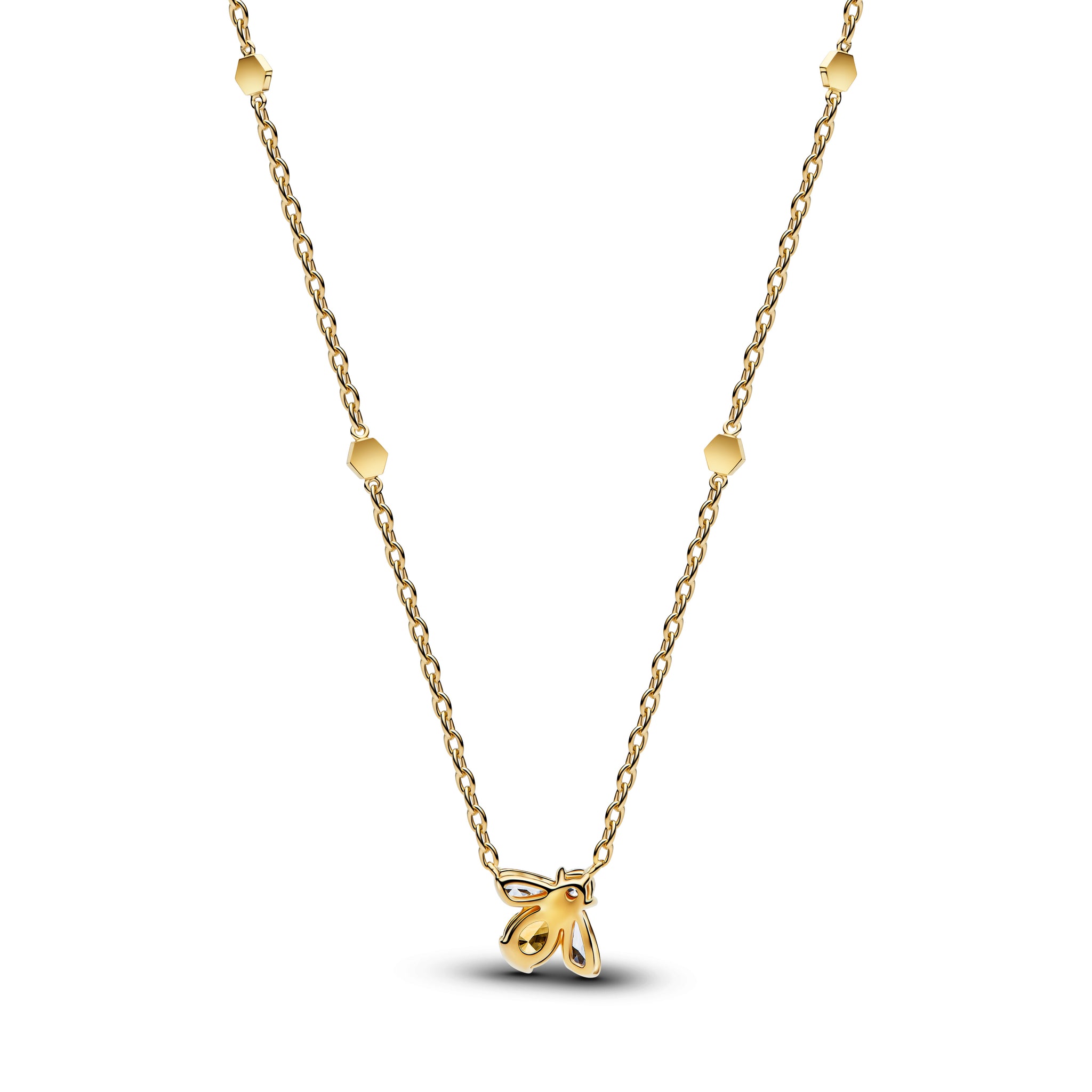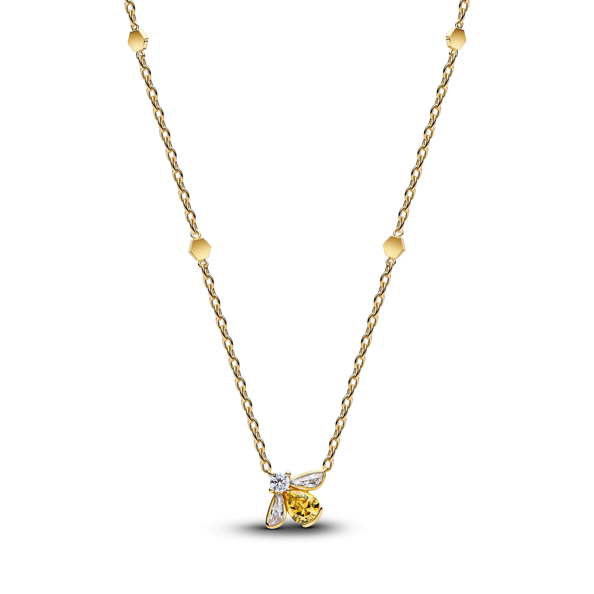 Get your style buzzing. Our 14k gold-plated necklace features a vibrant yellow and clear stone bee fixed on a chain with honeycomb details. Sweet sparkle fit for a queen bee.